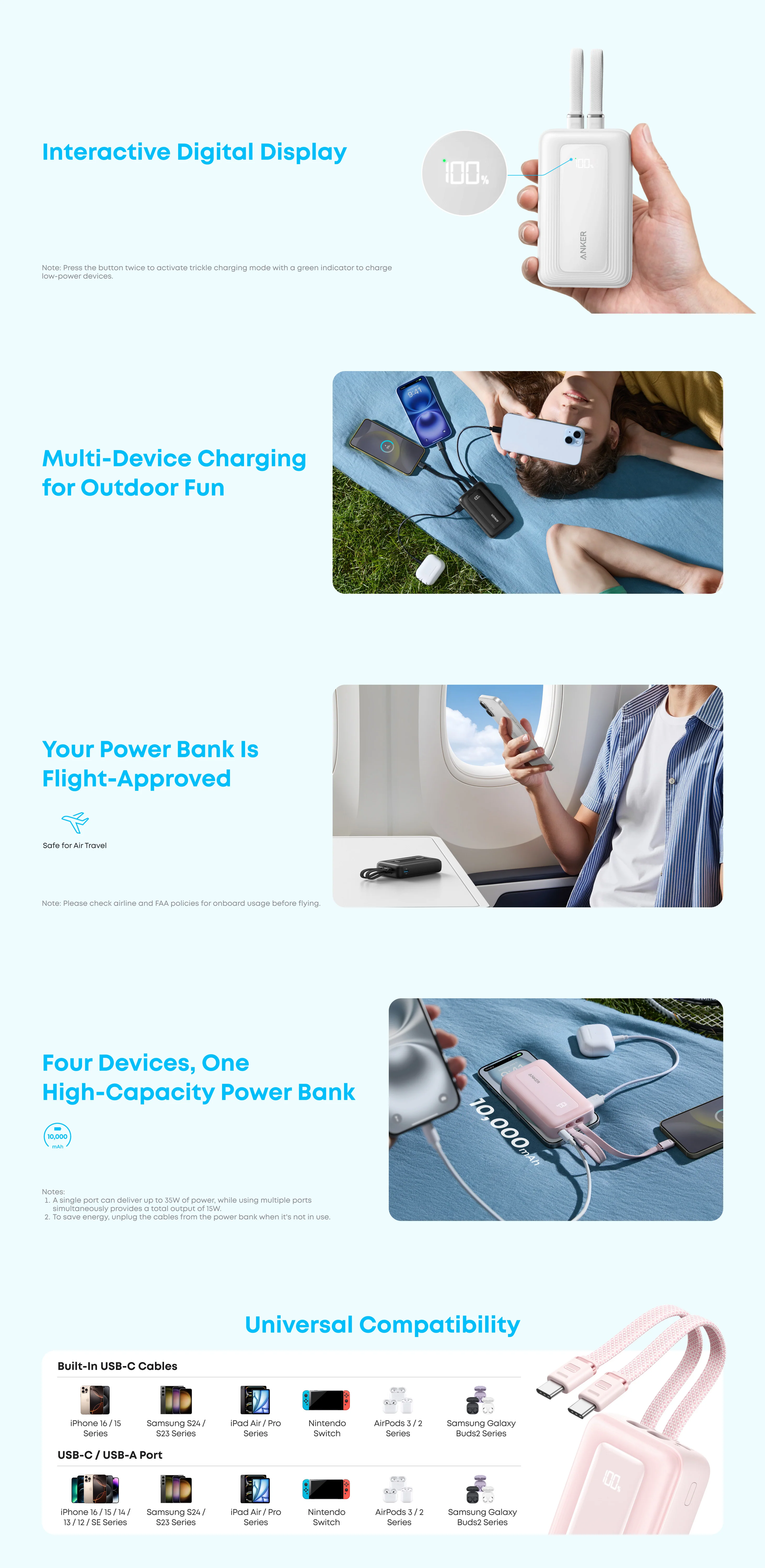 This power bank comes with dual built-in USB-C cables, eliminating the need to carry extra wires. The cables are durability-tested for over 10,000 bends, ensuring long-lasting performance.